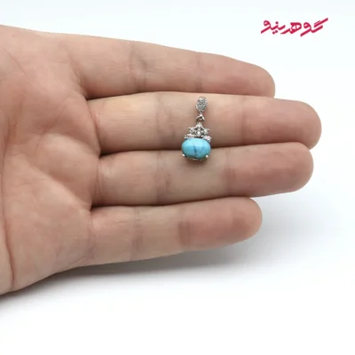 جنس قاب این گردنبند زنانه نقره عیار 925 است و نگین آن هم فیروزه نیشابور است.