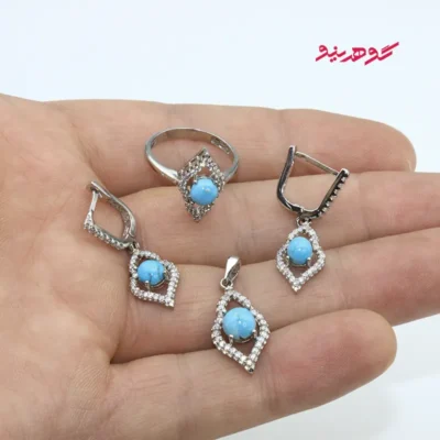 این نیم‌ست فیروزه نقره زنانه زیبا شامل گوشواره، گردنبند و انگشتر است، جنس این نیم ست زنانه، نقره عیار 925